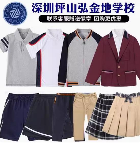 深圳弘金地国际学校校服夏季和春秋装都是以都市灰和藏青色为主色彩的POLO衫和拉链立领运动套装,同时还设计了白色拼接款的速干运动T恤。满足弘金地学生在各种场合都能穿上合适的校服。